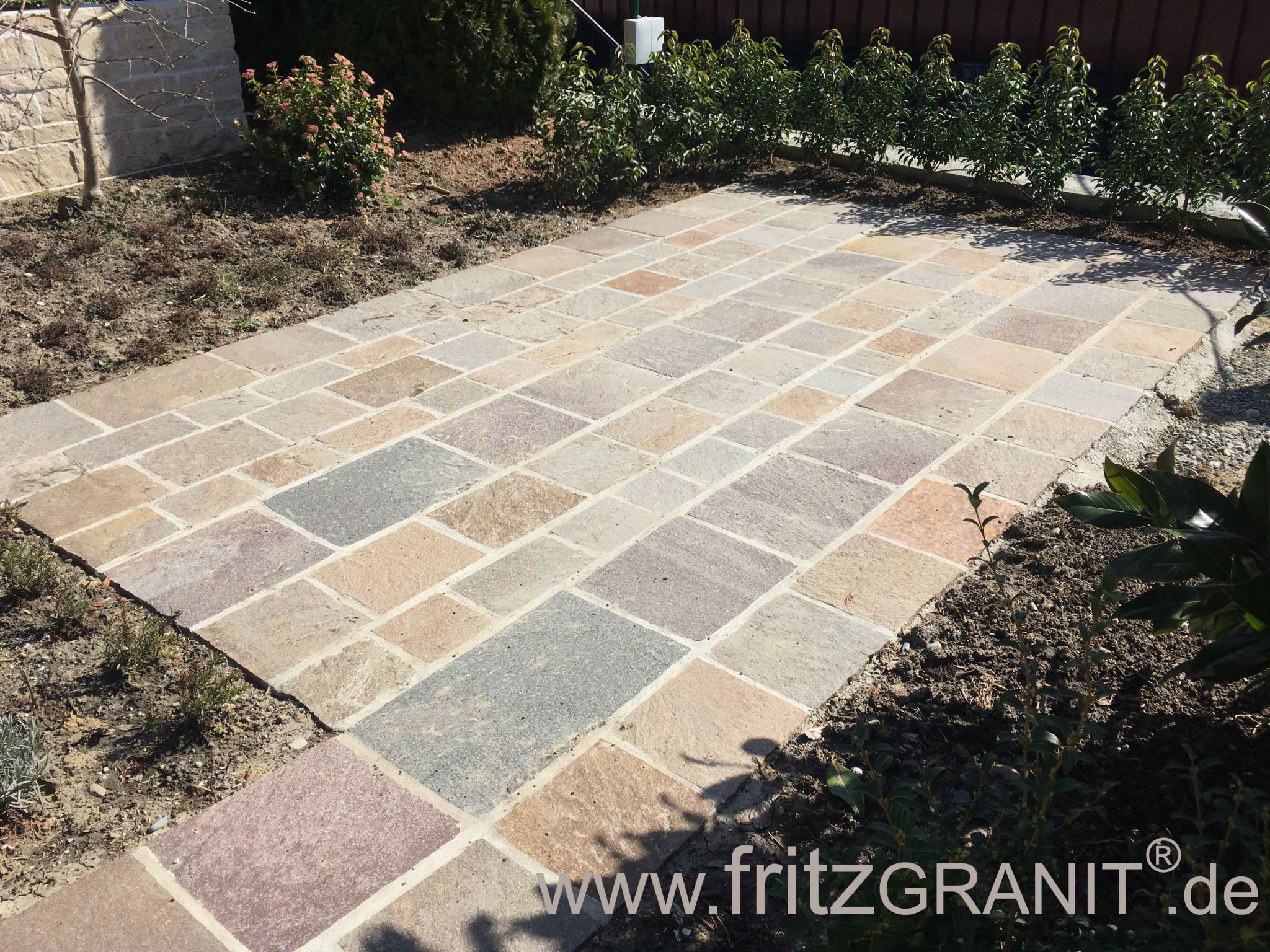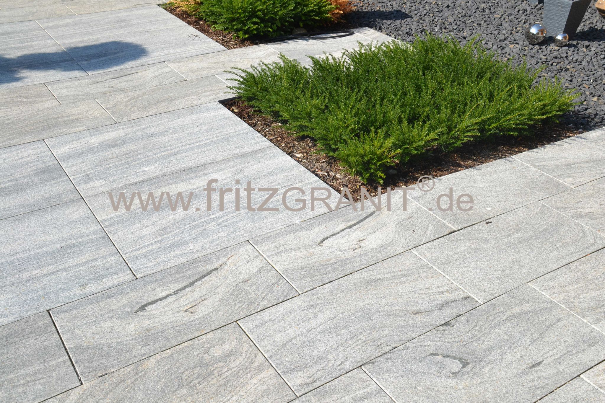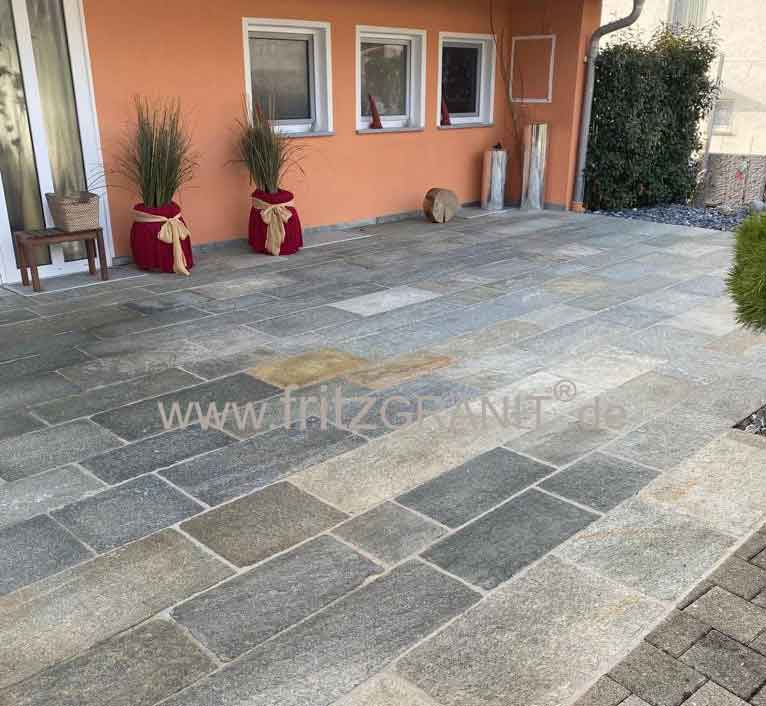 Oberfläche geflammt, Kanten gesägt, frostsicher, tausalzbeständig, + OF gebürstet , ca. 80 kg / qm bei teilweise oder ganz überdachten Flächen im Außenbereich - vorbehandeln