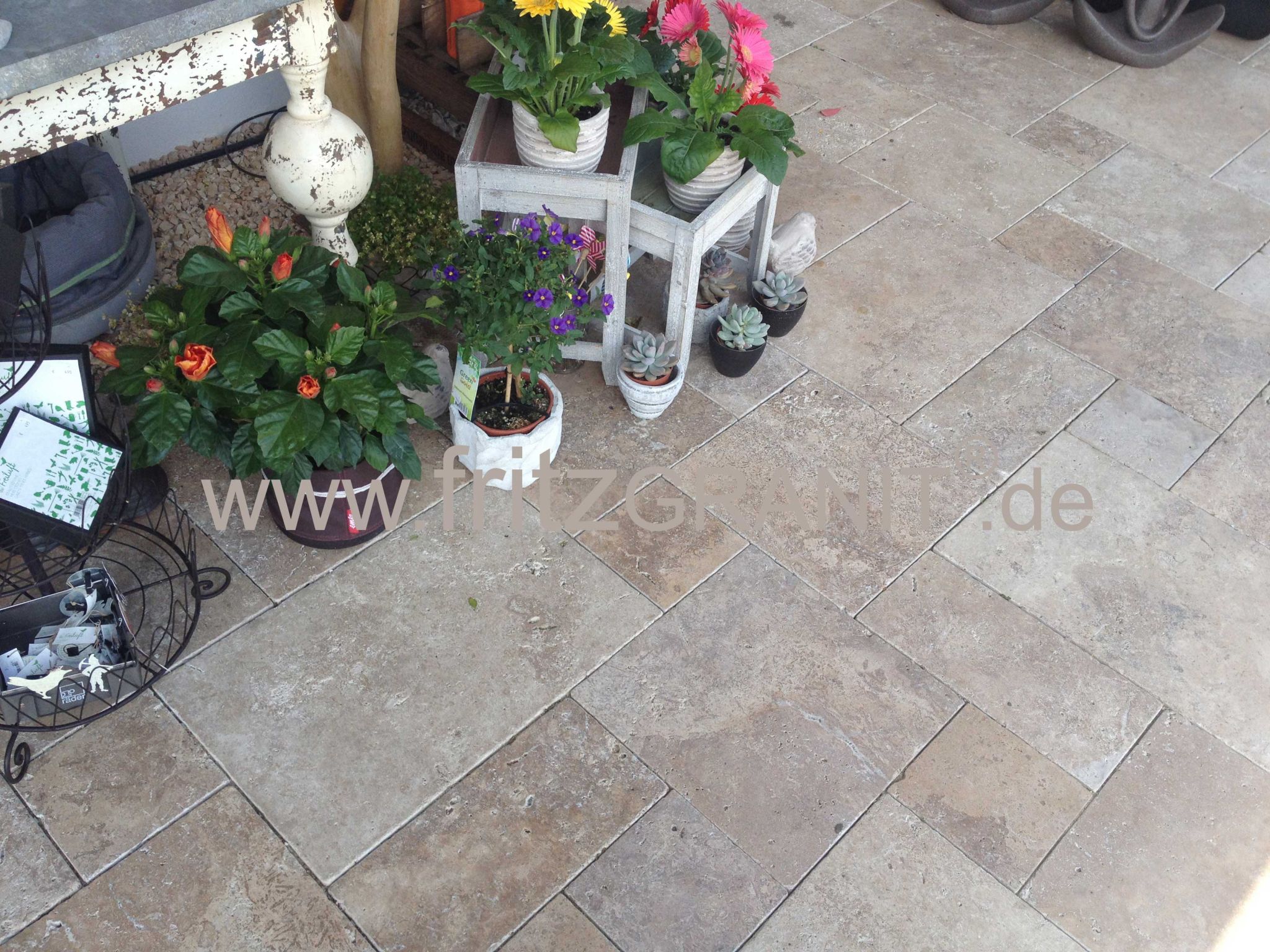 Oberfläche geschliffen, Kanten antik getrommelt, frostsicher, nicht tausalzbeständig, ca. 80 kg / qm